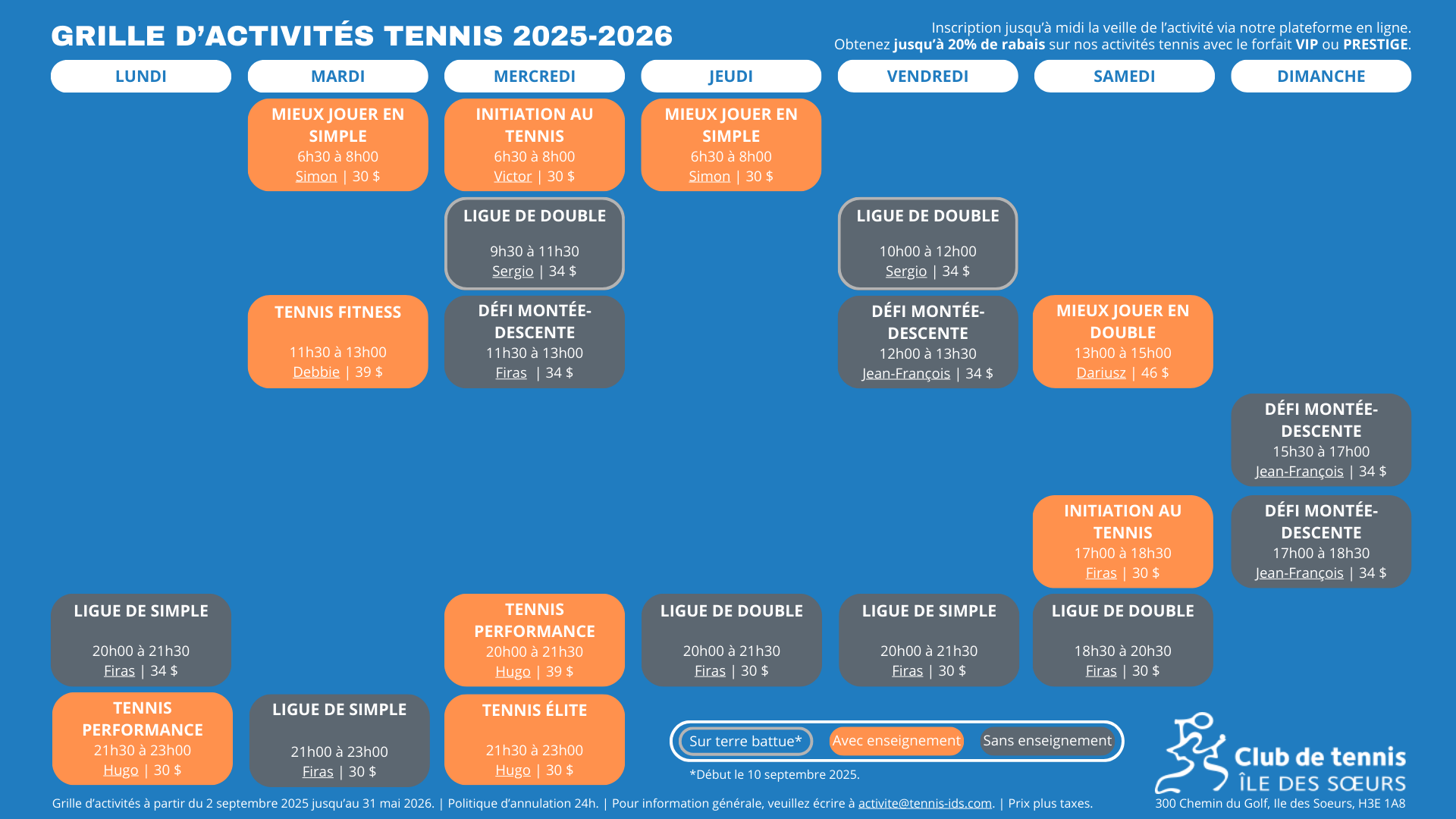 Pas de partenaire ? Vous souhaitez rencontrer de nouveaux joueurs ? Adepte du simple, du double ? Le Club de tennis Ile des Sœurs offre une grille d’activités, avec ou sans enseignement, qui vous permettra de trouver des partenaires, d’améliorer votre jeu et de profiter pleinement de votre abonnement.